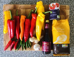 roughly chop the chillies, garlic and ginger and bung them in a food processor. De-seed and roughly chop the peppers and add them to the processor. Process the lot until very finely chopped.